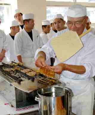 当会青年部部長「古賀秀喜」による“裂き”の模範演技と、本校OBの若手会員による“串打ち”の模範演技に触発され、生徒皆様が鰻調理の体験講座を、嬉々として受講されておりました。